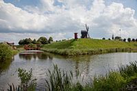 Oude vesting wallen rond oude dorp Bourtange met zicht op molen in noorden van Nederland