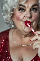 Op dit portret zien we een mollige, rijpe vrouw met opvallende make-up die met plezier op een zuurstok zuigt. Haar stralende glimlach verraadt haar genot in de zoete traktatie, terwijl haar lippenstift opvalt in een opvallende kleur. De combinatie van haar voluptueuze figuur en de zoete lekkernij geeft de foto een humoristisch tintje dat uitnodigt tot glimlachen. Het is een charmant en onconventioneel portret dat schoonheid in al haar vormen viert.
