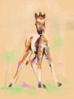 Modern kunstwerk van een pasgeboren veulen dat nog maar net staat. Vage snelle lijnen en zachte kleuren.