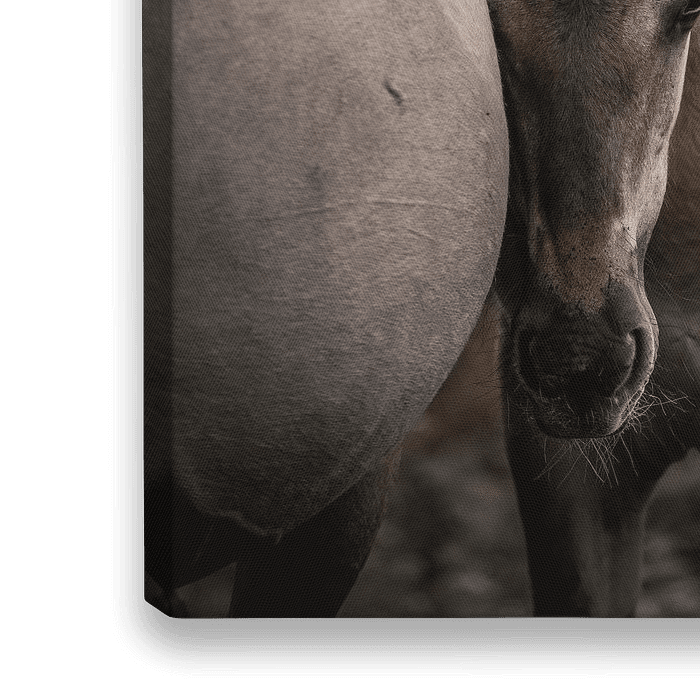 In dit intieme portret rust het hoofd van een jong veulen zachtjes tegen het lichaam van een volwassen paard, een ontroerend beeld van geborgenheid en vertrouwen. De zachte, natuurlijke kleuren en het subtiele licht benadrukken de tederheid van dit moment, terwijl de scherpe focus op het veulen zorgt voor een diepe emotionele connectie…