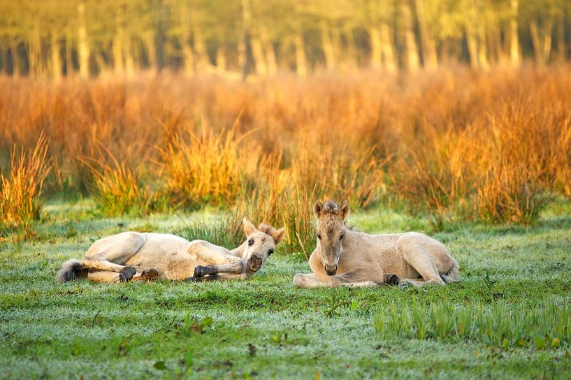 Tijdens een wandeling in het Midwolderbos in de provincie Groningen kwam ik deze tweeling tegen in het avondlicht. Het zijn de veulens van het przewalskipaard. In het voorjaar van 1982 is een kleine kudde in het bos losgelaten. Het doel is de herintroductie van deze, toen bijna uitgestorven, diersoort in Nederland.