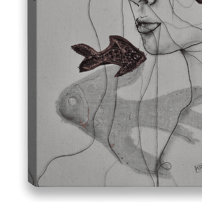 Dit is dus een liefdevolle parodie gemaakt met naald & draad, houtskool & textiel van een vrouw met "bril" & vissen. 🐟