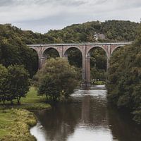 Het Viaduct van Conques (Viaduct du Conques) steekt trots af tegen de dramatische, stemmige lucht en creëert een fascinerend contrast tussen een door de mens gemaakt bouwwerk en de natuurlijke schoonheid van de Belgische Ardennen. De boogbrug strekt zich sierlijk uit over de Semois, omringd door weelderig gebladerte in het begin van de herfst en het rustige water eronder. De scène roept een gevoel van vredige sereniteit op, waarbij het viaduct dient als een bewijs van menselijke techniek te midden van het pittoreske Belgische landschap.