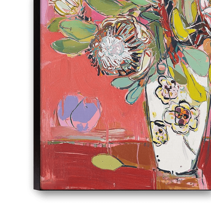 Vibrant Bouquet of Joy - Dit bloemen schilderij toont een kleurrijke vaas met grote, opvallende bloemen en groene bladeren, tegen een levendige roze achtergrond die een vrolijke en moderne uitstraling heeft, perfect voor elk interieur.