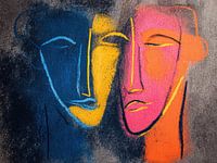 Vibrant Duo in Bold Colors - Dit abstract schilderij toont twee gezichten met felle kleuren, waarbij het rechter gezicht in roze en het linker gezicht in blauw is weergegeven, waardoor er een levendige en speelse indruk ontstaat.