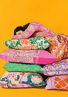 Een gedetailleerde gouache illustratie toont een gezellige scene met een kleine stapel sierkussens van verschillende stoffen, zoals zijde en katoen, die in een speels arrangement liggen. De kussens zijn rijkelijk versierd met een mix van patronen en kleuren: sommige zijn felroze en groen, met levendige geometrische vormen, terwijl andere subtiele bloemmotieven bevatten die de diversiteit van de stoffen benadrukken. In het midden van deze kleurrijke verzameling ligt een vrouw ontspannen, comfortabel genesteld tussen de kussens. Ze draagt een kleurrijke pyjama die perfect aansluit bij de levendige sfeer van de omgeving. De achtergrond is gevuld met een helder okergele tint, die het warme en uitnodigende gevoel van de illustratie versterkt en de kleurrijke details verder laat opvallen.