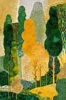 Details: abstract schilderij, schilderij bomen, kleurrijk bos, groen, geel, natuur, moderne kunst, speels,…
