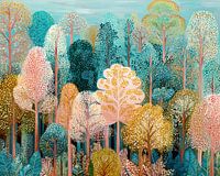 Details: bomen, natuur, vrolijk, schilderij, kleuren, mintgroen, goud, groen, roze,…