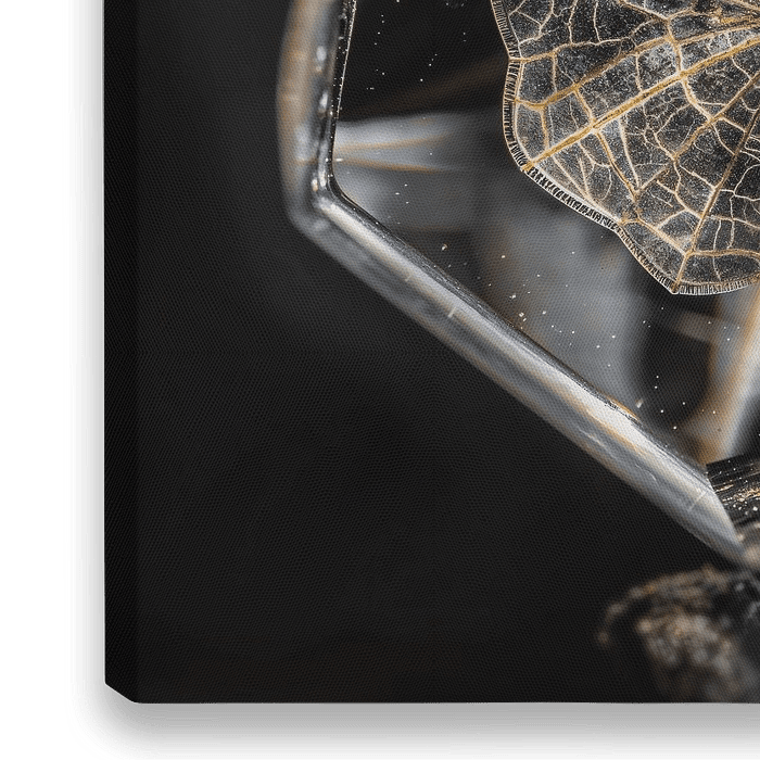 Vibrant Whispers 1 brengt de mysterieuze tinten van zwarte, transparante edelstenen tot leven tegen een dramatische achtergrond, waardoor er een gevoel van diepte en mystiek ontstaat. De gouden accenten contrasteren prachtig met de donkere edelstenen en vloeien als vloeibaar licht door het kunstwerk, wat een boeiend spel van licht en…