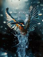 Een vibrante ijsvogel stijgt op uit het water, zijn schitterende vleugels spreidend. Druppels spatten van zijn felblauwe en oranje veren, glinsterend in het zonlicht. Met een vis stevig in zijn scherpe snavel, snelt hij omhoog, ogen vol focus. De lucht lijkt te trillen van zijn energie, terwijl hij elegant en krachtig boven het kabbelende beekje vliegt.