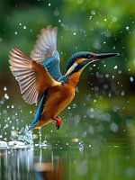 Een vibrante ijsvogel stijgt op uit het water, zijn schitterende vleugels spreidend. Druppels spatten van zijn felblauwe en oranje veren, glinsterend in het zonlicht. Met een vis stevig in zijn scherpe snavel, snelt hij omhoog, ogen vol focus. De lucht lijkt te trillen van zijn energie, terwijl hij elegant en krachtig boven het kabbelende beekje vliegt.