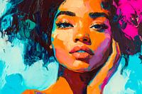 Levendige kleuren dansen op het doek en creëren een energieke uitstraling. De expressieve ogen en krachtige aanwezigheid van de afgebeelde persoon stralen zelfvertrouwen uit. Dit kunstwerk voegt een inspirerend en dynamisch accent toe aan elke kamer, vooral een woonkamer of creatieve werkruimte.