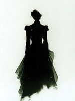 Dit kunstwerk toont een mysterieuze silhouet van een vrouw in een Victoriaans ogende jurk, weergegeven in een sterke zwart-wit contrast. De figuur lijkt bijna een schaduw, met een vervagend effect aan de onderkant van de jurk, wat een spookachtige of etherische uitstraling geeft. De hoge kraag, pofmouwen en de gelaagde tule in de rok suggereren een historische aristocratische stijl. De afwezigheid van gezichtsdetails versterkt het anonieme, ongrijpbare karakter van de figuur, waardoor het een surrealistisch en enigszins unheimlich gevoel oproept. Dit werk past binnen een fine-art en conceptuele fotografie stijl met een donkere, bijna gotische sfeer.
