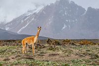 Deze Vicuna kijkt nieuwsgierig naar de fotograaf en twijfelt of hij de benen zal nemen. Aan de horizon is een deel van Mount Chimborazo zichtbaar. Deze uitgestorven vulkaan en de hoogste berg van Ecuador domineert het landschap op grote hoogte in het Andes gebergte van Ecuador. Het landschap is ruig en verlaten, alleen Vicuna's laten zich gelukkig weer met enige regelmaat zien