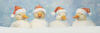Vier lieve eendjes klaar voor de kerst. De pastelkleuren en het lage contrast zorgen voor een serene uitstraling. Breng de gezelligheid van kerst in jouw huis met dit charmante werk!