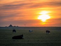 Vier Koeien grazen in de ochtend zon.