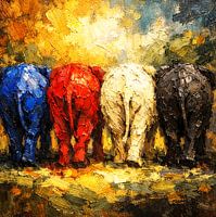 Dit kunstwerk toont vier olifanten die naast elkaar staan, gezien van achteren, elk in een opvallende en contrasterende kleur: blauw, rood, geel en zwart. De dikke, expressieve verfstreken en de rijke textuur verraden een duidelijke impasto‑ en moderne abstracte schilderstijl, waarbij kleur en vorm belangrijker zijn dan realistische…