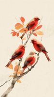 Dit kunstwerk toont vier rood getinte vogels die samen op een boomtak zitten, omringd door warme herfstbladeren in oranje‑ en roodtinten. De achtergrond bestaat uit een zachte beige kleur met een aquarelachtige structuur, waardoor de vogels en bladeren extra helder naar voren komen. De elegante vormen, subtiele penseelstreken en…