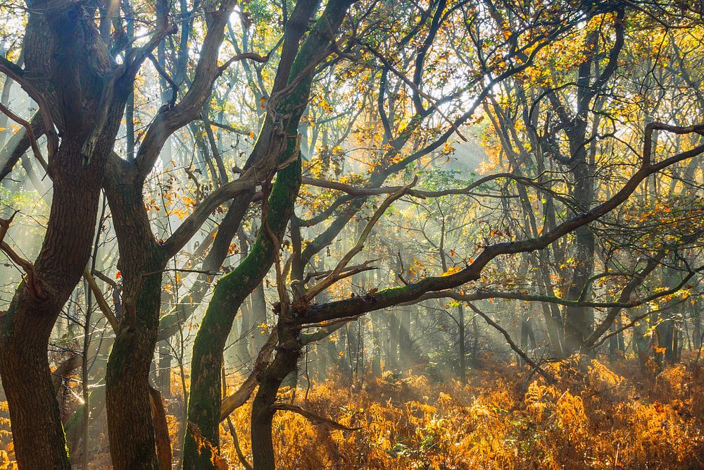 Op een mistige herfstochtend wilde ik graag de grilligheid van de boomstammen in het strubbenbos bij Anloo proberen te vangen. De zon zou er ook nog bijkomen en dat zou mooie zonneharpen kunnen opleveren. Ik koos uiteindelijk dit groepje van 4 bomen uit. De zon kwam er mooi doorheen en zorgde voor een mooie gloed over het landschap. De zonnestralen zorgden ervoor, dat de bomen net een beetje geïsoleerd werden van de rest van de bomen; tenslotte kan het er behoorlijk rommelig uitzien in een strubbenbos. Varens in herfstkleur zorgen voor een mooie oranje ondergrond. De grillige boomstammetjes zijn uitlopers van een strub of stobbe. Zo'n strub kan wel een breedte van zo'n 20 meter hebben onder de grond! Leuk om er over na te denken wat zich in een bos als dit allemaal nog onder de grond bevindt. Deze bossen hebben zich zo ontwikkeld door regelmatige houtkap en door begrazing. Schapen aten telkens de jonge uitlopers op waardoor de bomen geen kans kregen goed omhoog te groeien. In de avond en nacht kan het er geheimzinnig uitzien in dit bos met al die grillige stammetjes.