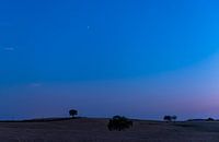 Vier bomen op een veld in Valveron tijdens zonsondergang, vroege nacht met sterren.