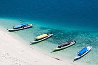 Vogelvlucht van een wit zandstrand van een eiland in de Indische Oceaan met vier boten in het helderblauwe water.