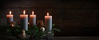 Vier brandende kaarsen op een adventskrans van dennentakken met kerstversiering tegen een donkere rustieke houten wand, panoramaformaat met kopieerruimte, geselecteerde focus, smalle scherptediepte