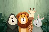 Koop dit leeuwen kunstwerk Vier dierenvrienden bos avontuur groene jungle van MArt op canvas, aluminium dibond, (ingelijste) fotoprint, behang en ArtFrame, op maat geprint in Fine-Art kwaliteit.