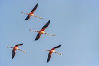 De felroze flamingo's van Bonaire hebben een geheim die ze goed verborgen houden en alleen in vlucht niet verborgen kunnen houden: Ze hebben zwarte ondervleugels. In dit rustige werk vliegen er vier flamingo's over. Waar gaat hun reis naartoe?