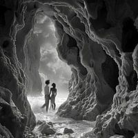 “Vier het lot en het leven” is een meeslepend kunstwerk dat de kijker uitnodigt om de diepten van menselijke verbinding en de majesteit van de natuur te verkennen. Het middelpunt van dit stuk is een paar, gevangen in een moment van serene intimiteit, omringd door de organische pracht van rotsformaties.