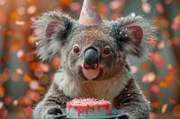 Grappige koala viert verjaardag in jaren 60/70 discostijl met kleurrijke taart en confetti.