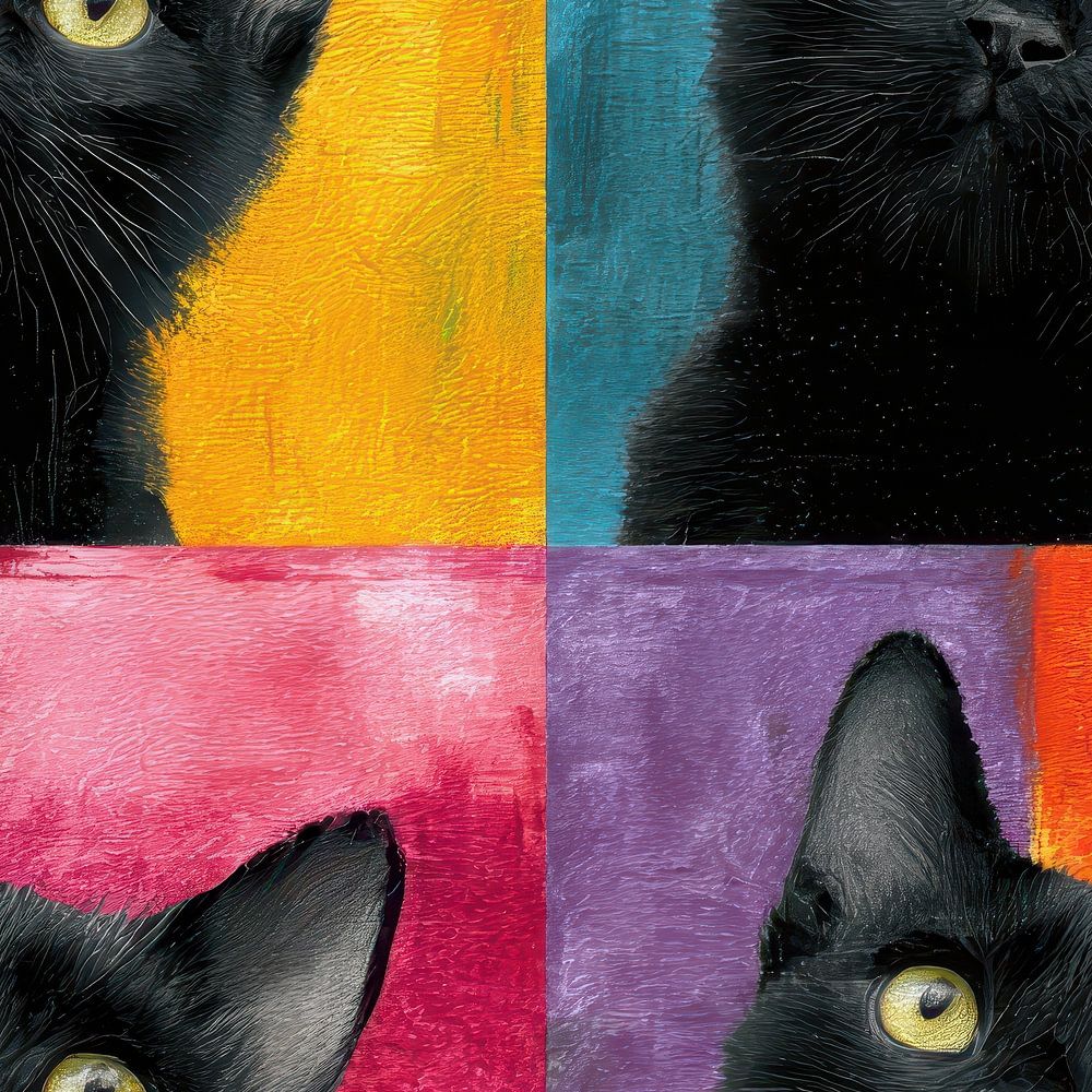 Trefwoorden: popart katten schilderij, kleurrijke kat kunst, digitaal kattenportret, moderne wanddecoratie kat, speels kunstwerk kat, kat popart stijl, vrolijke kunst voor kinderkamer, zwart kat illustratie, vierluik katten schilderij, kleurrijke digitale kunst