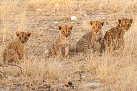 In Etosha NP in Namibië in Afrika zitten vier welpjes van een leeuw op een rij. Ze zitten op één lijn, in droog, geel, kort woestijngras met zacht beige zand.