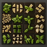 Minimalistische kunst met ingrediënten van pesto - basilicum, pijnboompitten, knoflook en Parmezaanse kaas - verwerkt in een speels patroon geïnspireerd op Vier op een Rij.