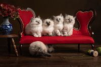 Vier schattige ragdoll kittens op een klassieke rode bank in een stilleven setting