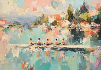 Dit impressionistische schilderij toont vier mensen in een lange, witte roeiboot die diagonaal over kalm water glijdt. De roeiers zitten naast elkaar, de armen uitgestrekt, in lichtgekleurde shirts en shorts. Zachte penseelstreken in blauwe, groene, roze en oranje tinten creëren beweging en reflecties op het wateroppervlak. Op de…