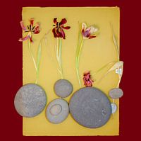 Deze vier uitgebloeide tulpen maken deel uit van een langlopend kunstproject. De gekozen compositie is een vaste factor in dit project. In maart 2018 heb ik de vier tulpen op een zeefdrukraam geplaatst. Om de gekozen compositie te fixeren heb ik er tijdelijk stenen opgelegd. Deze stenen komen uit Wales, 35 jaar geleden gevonden.…