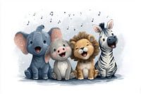 Muziek, babydieren, safari, aquarel, olifant, leeuw, zebra, nijlpaard, kinderkamer, zingen, schattig, vriendschap, babykamer, wilde dieren, vrolijk, muzieknoten, illustratie, Afrika, dieren kinderen, blauw, decoratie, kleuterschool, samen, zacht, speelkamer, vreugde, melodie, zacht, muziekschool, grappig