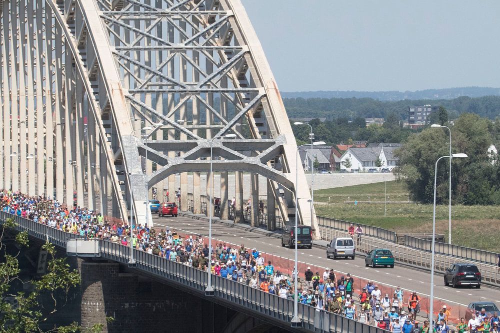 Betuwe 18-07-2017. Dinsdag is de eerste dag van de Vierdaagse. Vanuit Nijmegen steken de wandelaars de rivier de Waal over via de verkeersbrug de Waalbrug. Vandaar lopen zij door Lent naar Oosterhout. Dan naar Elst en Bemmel. FOTO: S4D/GER LOEFFEN