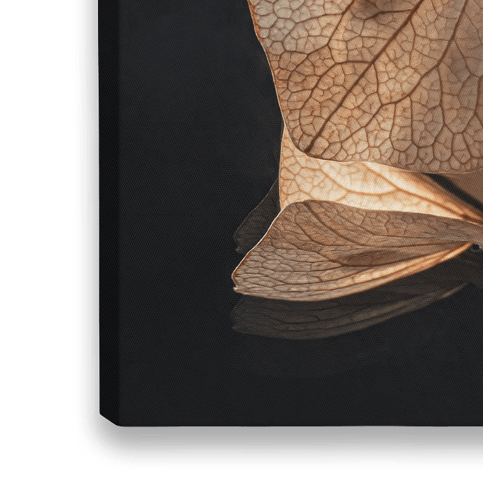 "Vierkant met "dansende" hortensiablaadjes" is een macrofoto van een aantal hortensiablaadjes die aan een steeltje vast aan elkaar zitten. Deze blaadjes zijn als deels verdroogd waardoor je de prachtige nervenstructuur goed ziet. Dit wordt nog eens versterkt door het licht wat erop valt, die maakt de nervenstructuur nog beter zichtbaar. Doordat de blaadjes op een spiegelend oppervlak staan op de puntjes van de blaadjes, lijkt het net of de blaadjes dansen. De achtergrond van deze foto is donker van kleur, waardoor de blaadjes mooi op de voorgrond lijken te komen.