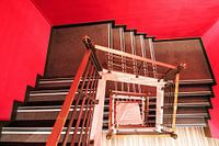 Prachtige abstracte interieur opname van een vierkant rood trappenhuis