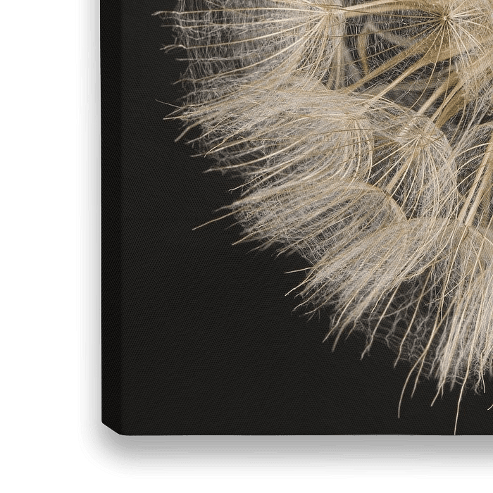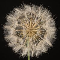 "Vierkantje met Morgenster (Tragopogon) in het licht met donkere achtergrond" is een macrofoto die ik gemaakt heb van een pluizenbol van een Tragopogon (in het Nederland ook wel Morgenster genoemd). Deze plant behoort tot de Composietenfamilie ( Asteraceae) net als de paardenbloem. Net als bij de paardenbloem verandert de bloem van de Tragopogon na het bloeien in een prachtige pluizenbol. De pluisjes verschillen wel met die van de paardenbloem. De pluisjes van een Morgenster (Tragopogon) lijken een beetje op spinnenwebbetjes die aan het steeltjes met de zaadjes vastzitten. Als je inzoomt op dit werk kun je dat goed zien. Bij het maken van dit werk heb ik gekozen voor een geringe scherptediepte. Hierdoor ontstaat er diepte in de foto: Hoe verder je naar achter kijkt in het werk, hoe vager de pluisjes worden.