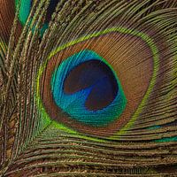 "Vierkantje met een kleurrijke pauwenveer" is een macrofoto van een prachtige pauwenveer, met mooie bruin, groen en blauwtinten, die bovenop een stapel andere pauwenveren ligt. Als je inzoomt zie je dat ik bij het maken van deze foto gekozen heb voor een geringe scherptediepte, zodat de nadruk op de voorste pauwenveer komt te liggen. De mooie structuur van de pauwenveer is bij de bovenste veer hierdoor mooi te zien, bij het oog van de veer.