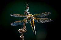 De viervlek libel is er eentje uit de korenbouten familie. Hier rust er eentje op onkruid. Een hoog contrast door de donkere achtergrond brengt mooi de gouden kleuren van de libel naar voren.