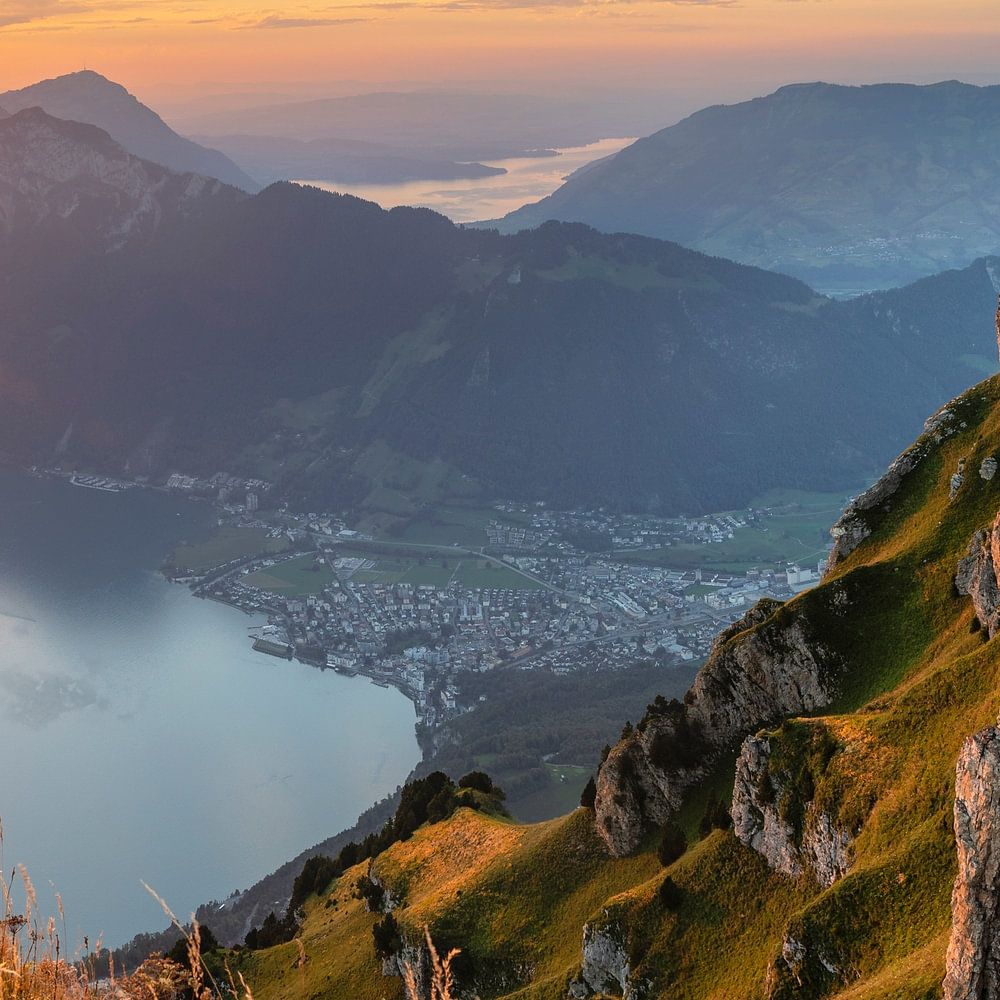 Uitzicht op het Vierwoudstedenmeer vanaf de Fronalpstock, Schwyz, Zwitserland