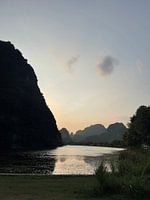 Het prachtige berggebied in Tam Coc, Vietnam. Op de foto zie je een zonsondergang tussen de bergen.