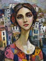 Vietnam Vrouw Schilderij | Droomachtige Stadsportretten - Op dit schilderij zie je een vrouw met een opvallende uitstraling en een achtergrond van huizen, met een mix van levendige kleuren en een moderne stijl.