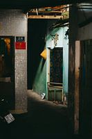 Je kijkt een smalle steeg in waar een stukje zon precies op een deuropening valt. Bij die deur hangen een hoed en een gordijntje, en op de grond staan twee losse schoenen. Links staat een scooter geparkeerd. Het voelt alsof je langs iemands huis loopt op een rustig moment, zonder dat er iemand te zien is.