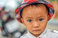 Een lief Vietnamees jongetje met een hoedje op zijn hoofd kijkt met grote ogen en een intense blik voor zich uit.