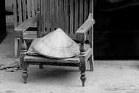 Vietnamese bamboe hoed in vintage houten rookstoel uit grootmoederstijd. Kamer in een verlaten woning in Vietnam. Urban exploring, Urbex.
