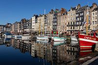 De foto vangt de rustige schoonheid van de oude haven in Honfleur, in Normandië, Frankrijk, met de charmante weerspiegelingen van boten en gebouwen op het water. De vroege ochtendzon verlicht de historische gebouwen met een zachte gloed. Een mooi souvenir van je bezoek aan de Franse Calvados regio.